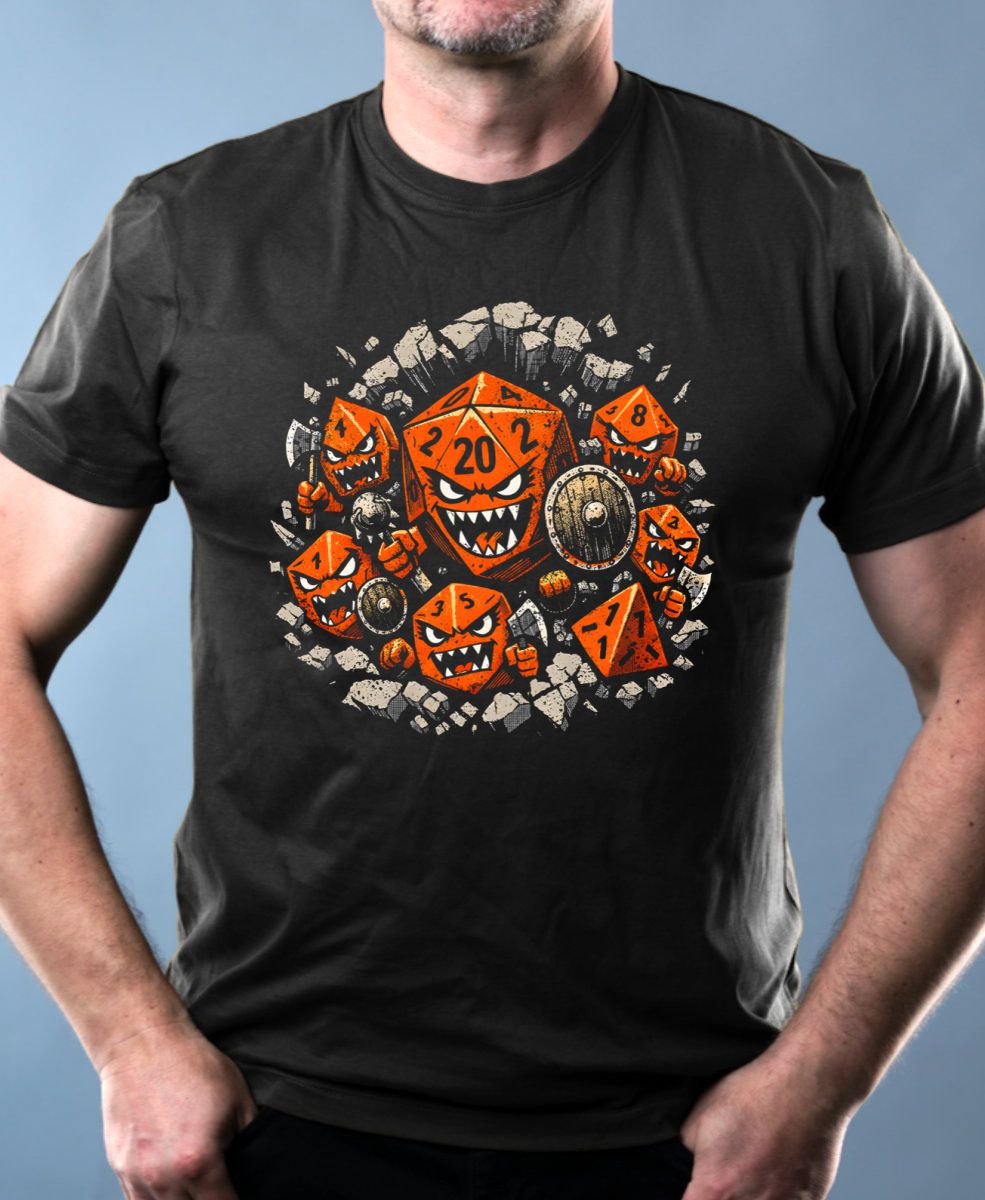 Zuřivé RPG kostky. Když se hod kostkou trochu zvrtne a hra ožije víc, než jste čekali. Tento dravý design s oživlými hracími kostkami je perfektní výbavou pro každého fanouška Dračího doupěte a stolních RPG her. Tričko, mikina, kšiltovka, zástěra, tílko, hrnek, půllitr, plechový hrneček